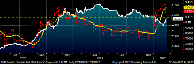 In fact, all of the months of ’22, excluding February and March, have been rangebound, trading somewhere in the $900 – $1,000 range. After peaking above 900k last month, open interest has declined and appears on pace to finish around 800k when the February contract expires next week. Open interest is how many outstanding futures contracts there are at the end of each day. In the chart below, the red line is the aggregate open interest across all futures months with the yellow dotted line a 22-day moving average.