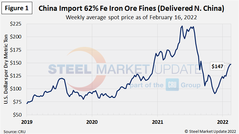 After rising to record levels last summer, the Chinese import price of 62% Fe content iron ore fines declined through November, reaching an 18-month low. Prices have since risen and continue to trek upward; Figure 1 shows the price of 62% Fe delivered North China at $147 per dry metric ton as of Feb. 16. Iron ore prices have increased 18% in the last 30 days, up 62% compared to three months ago, but down 12% from the price this time last year. A Feb. 16 article from CRU provides some backstory: “Higher hot metal production and pre-CNY restocking continued to support the iron ore price since mid-January, but the increase during and after CNY exceeded the justifiable level by supply-demand changes. The rapid and substantial increase was associated with speculative trading. This led to the Chinese government launching a probe into iron ore pricing, following which iron ore prices started to tumble.”