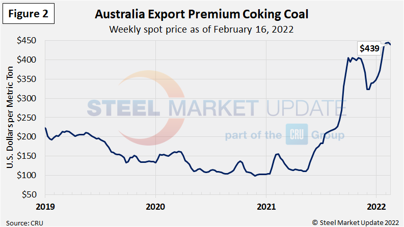 The price of premium hard coking coal FOB east coast of Australia was $439/dmt as of Feb. 16, with the week prior having reached a new record high of $445 (Figure 2). A recent CRU report notes coking coal prices are increasing due to persistently tight supply from major supply basins. Prices have increased 9% in the last 30 days, up 13% compared to three months prior, and up 203% from prices one year ago. Prior to 2021, the record high for coking coal prices was $400 per ton in July 2008.
