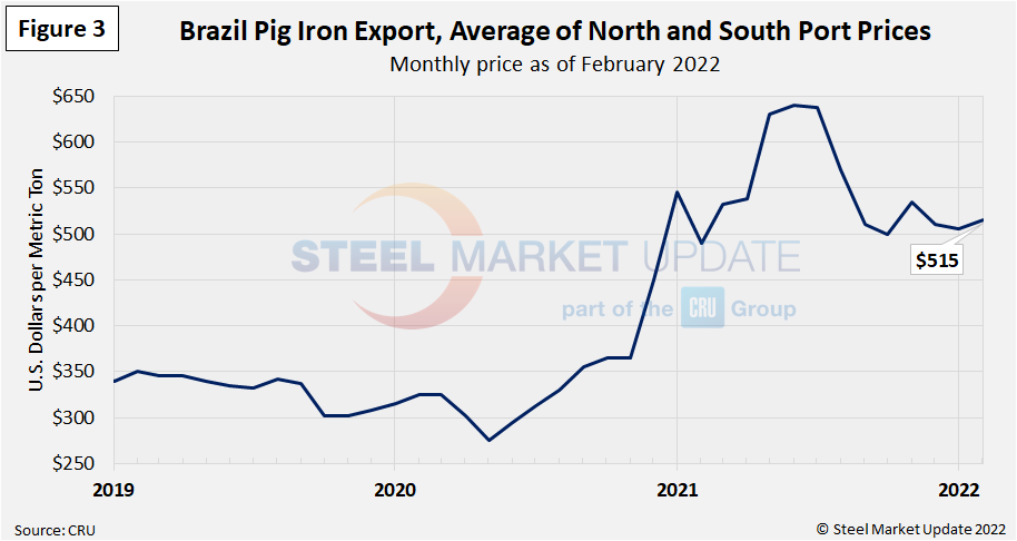 Most of the pig iron imported to the U.S. currently comes from Russia, Ukraine and Brazil. This report summarizes prices out of Brazil and averages the FOB value from the north and south ports. Pig iron prices have remained relatively stable since September 2021, up $10 month-over-month to $515 per metric ton in February. Although down compared to last summer, pig iron prices have remained historically high for over a year. Recall that pig iron prices had reached a multi-year low of $275 per metric ton in May 2020 (Figure 3).