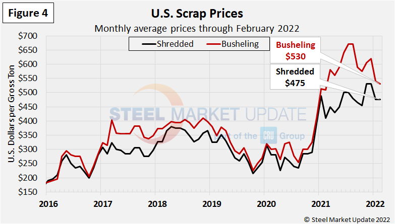 Scrap prices were relatively flat from January to February, remaining in line with levels seen in the last few months. February shredded scrap prices were unchanged at $475 per gross ton, still near the 15-year high seen in December. Busheling scrap prices declined 2% in February to $530 per gross ton (recall the record high of $670 seen back in July/August). Prior to 2021, the previous record for scrap prices over the last decade was $510 per ton for busheling in December 2011 and $473 per ton for shredded in February 2012.