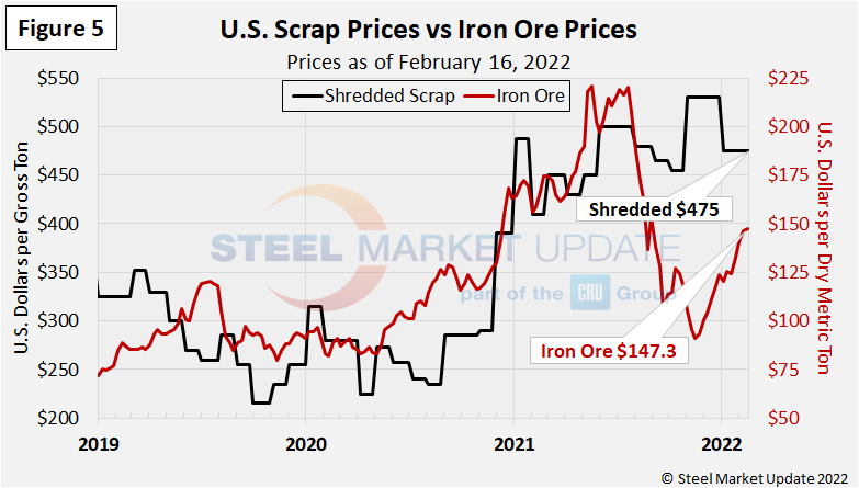 Hot rolled steel prices fluctuate up and down with the price the mills must pay for their raw materials. Changes in the relationship between scrap and iron ore prices offer insights into the competitiveness of integrated mills, whose primary feedstock is iron ore, versus the minimills, whose primary feedstock is scrap. Figure 4 shows the spread between shredded and busheling scrap, priced in dollars per gross ton in the Great Lakes region.
