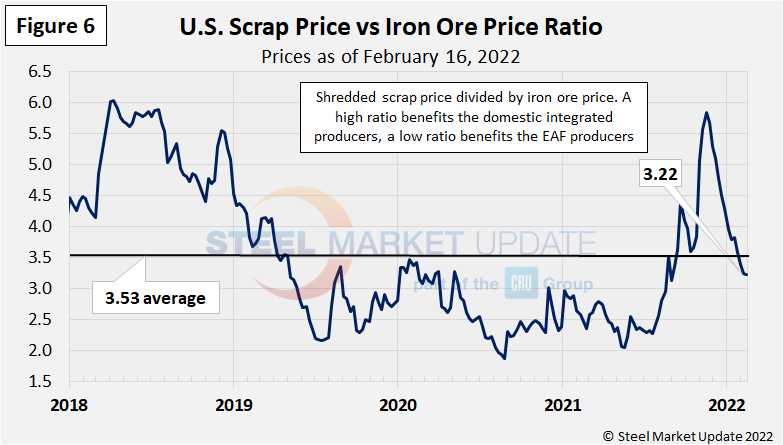 To compare the two, Steel Market Update divides the shredded scrap price by the iron ore price to calculate a ratio (Figure 6). A high ratio favors the integrated/BF producers, a lower ratio favors the minimill/EAF producers. At the current 3.22 ratio shown below, the cost advantage held by integrated producers was short-lived, having just surpassed the black four-year average ratio line in late-August 2021. Three months ago, we saw a ratio of 5.84, the highest seen since mid-2018. The scrap to iron ore ratio reached a record low of 1.86 in August 2020 (within SMU’s limited 12-year data history).