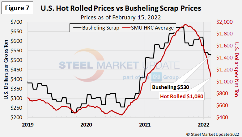 Figure 7 shows how the price of hot rolled steel generally tracks with the price of busheling scrap. Bush declined $10 per gross ton over the past month, down $140 from the July/August peak, but up $20 from one year ago. The SMU hot rolled price average declined last week for the 19th consecutive week, with the Feb. 15 average down $110 week over week to $1,080 per ton. This is down $345 from the prior month, down $875 from the early-September peak, and down $120 from one year ago.