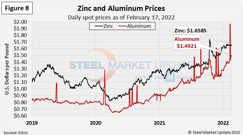 Zinc, used to make galvanized and other products, continues to increase in price. The LME cash price was $1.66 per pound as of Feb. 17, up 14% from three months prior and up 31% from the same time last year (Figure 8). The LME cash price for zinc reached a multi-year high of $1.74 per pound in October.