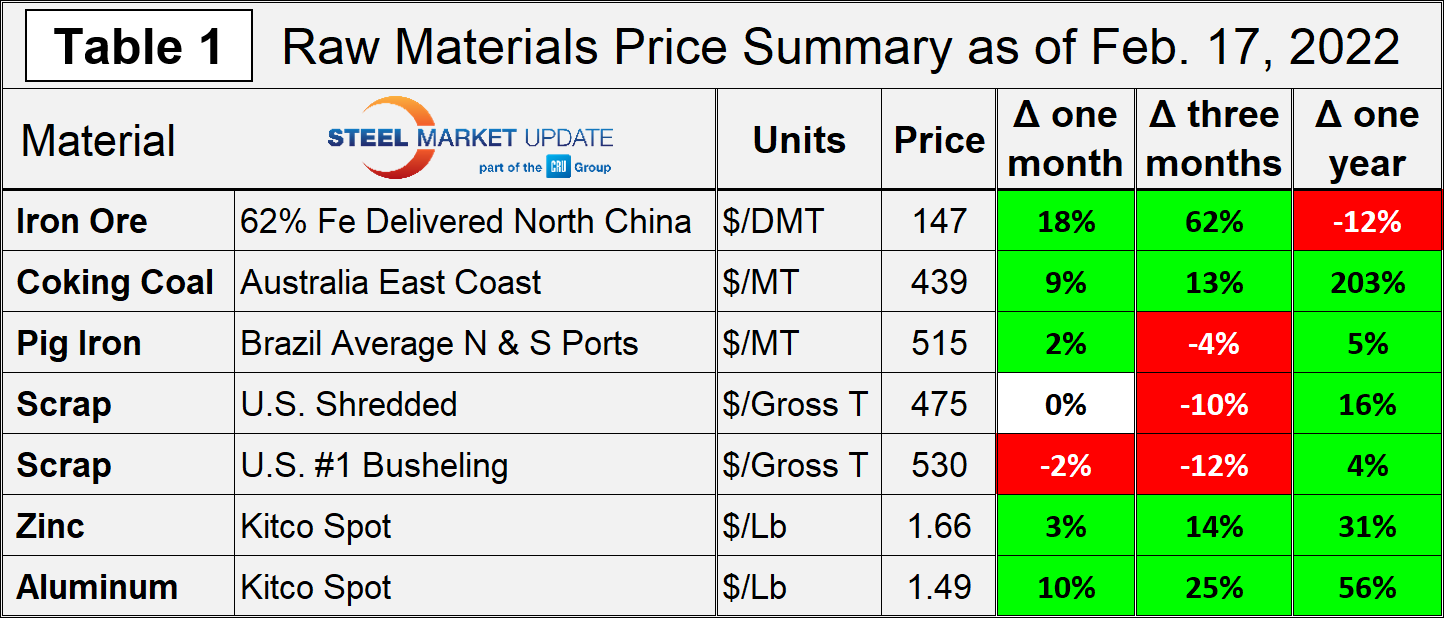 Prices for five of the seven steelmaking raw materials tracked in this SMU analysis increased over the last 30 days, with only one product decreasing. Through Feb. 17, iron ore prices rose 18% from one month prior, aluminum prices increased 10%, coking coal prices rose 9%, zinc prices were up 3%, and pig iron prices rose 2%. In that same time frame, scrap prices were flat to down 2%.