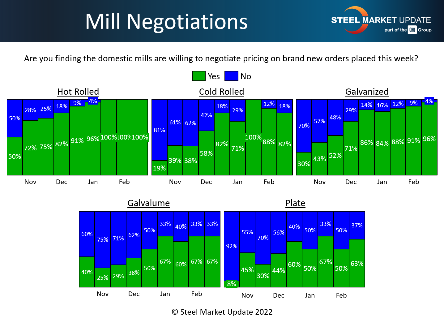Every two weeks, Steel Market Update asks readers: Are you finding the domestic mills willing to negotiate spot pricing on new orders placed this week? The vast majority of buyers in every product category tell SMU that mills are in a deal-making mode to secure sales before the next price drop.