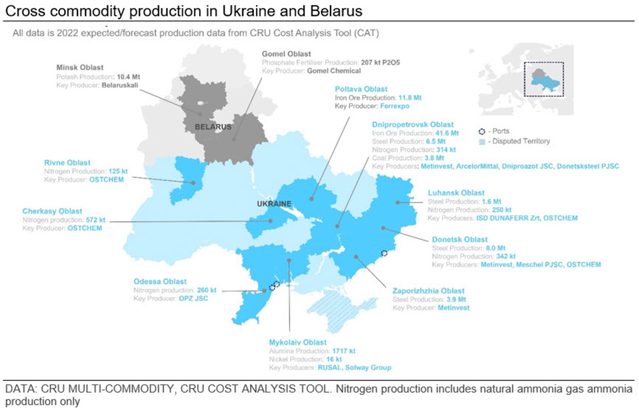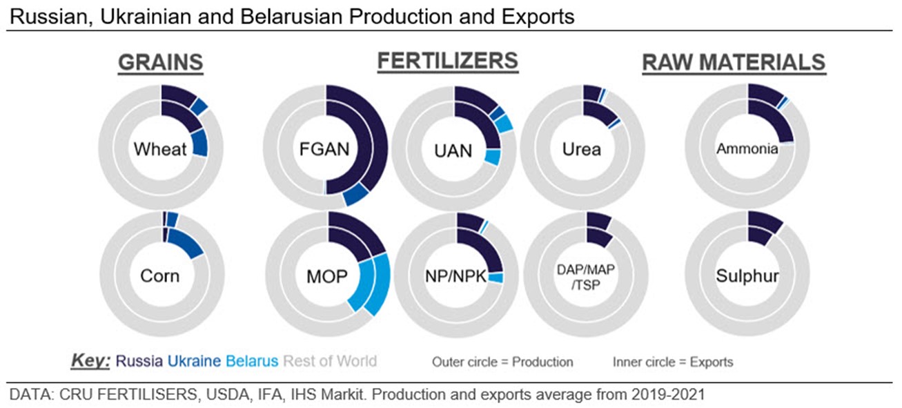 Russia, Ukraine, and Belarus are key producers and exporters in the global grains, fertilizers, and fertilizer raw materials markets.