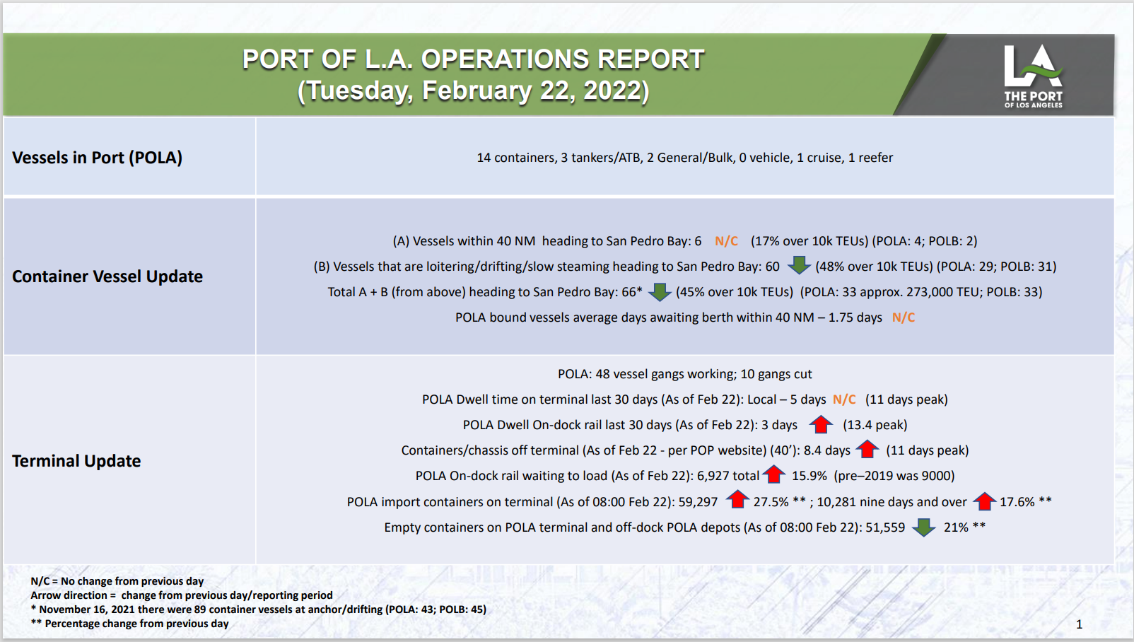 As North America’s busiest port, the Port of Los Angeles has received a lot of negative publicity over the supply-chain bottlenecks caused by the pandemic, as scores of ships from Asia and other parts of the world have stacked up offshore waiting for a place to unload. While port operations still have a long way to go before they return to normal, the latest operations report as of Feb. 22 showed 66 container vessels loitering off San Pedro Bay, an improvement from a count of 89 three months ago (see chart).