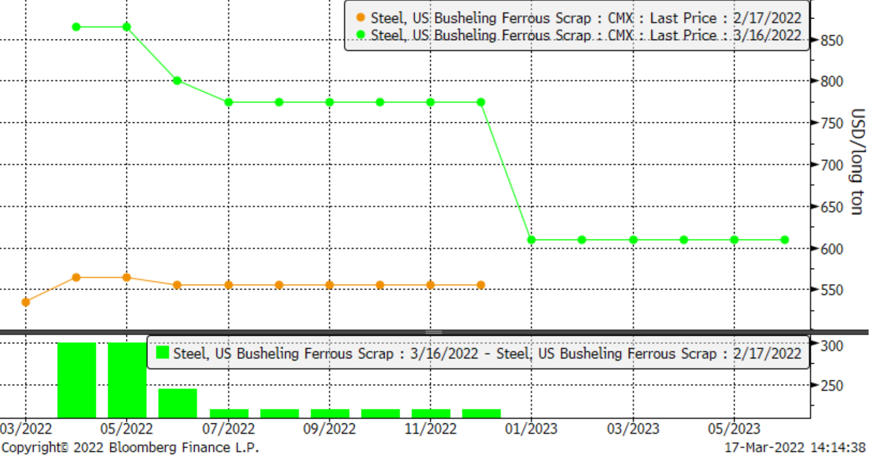 The following charts are the typical comparisons of the month-over-month changes in the HRC and Busheling scrap futures forward curve, but these charts are in no way normal. In fact, they look more like star constellations than a normal futures curve.