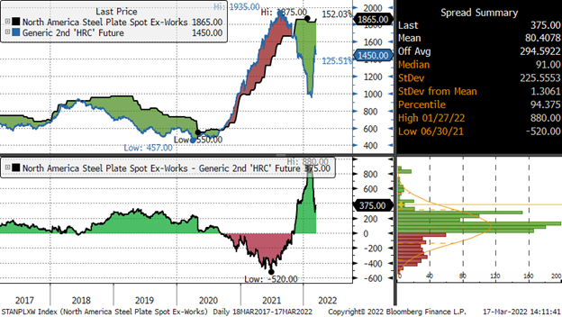 Considering the massive price rally on HRC/scrap futures, suddenly the plate to HRC spreads no longer seem as egregious as recent plate price increases have not kept pace with HRC/scrap increases. Looking at the spread between the HRC forward curve 2nd month futures and physical plate prices, we are seeing a normalization of the spread compared to recent historical levels.
