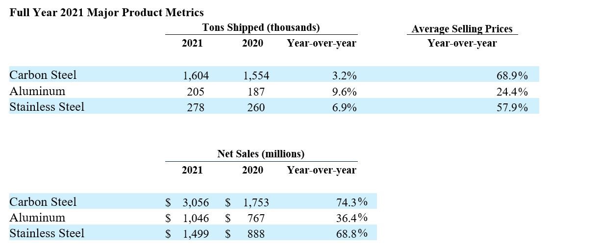 In market commentary, Ryerson executives said U.S. commodity markets experienced a pricing dichotomy in the fourth quarter, with flat carbon steel products declining while prices for aluminum and stainless steel remained elevated. “At this point, given underlying supportive demand conditions and gradually improving metals availability, Ryerson anticipates that carbon prices will gradually decline in the first quarter of 2022 while aluminum and nickel maintain relative strength compared to their historical averages,” the company said. The company’s diversified product mix now includes approximately 50% bright metals.