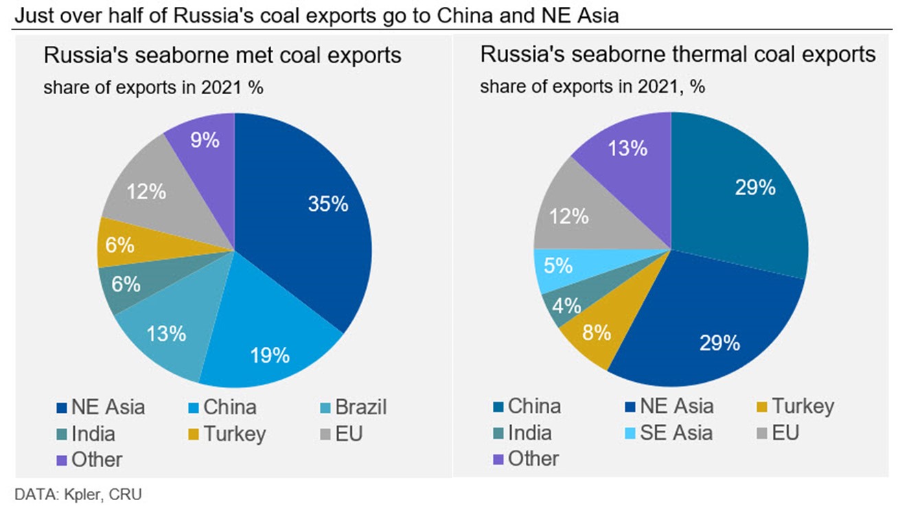 Around 54% of Russia’s seaborne metallurgical coal exports and 58% of seaborne thermal coal exports went to China and Northeast Asia last year. EU countries accounted for around 12% of Russia’s seaborne exports for both metallurgical and thermal coal.