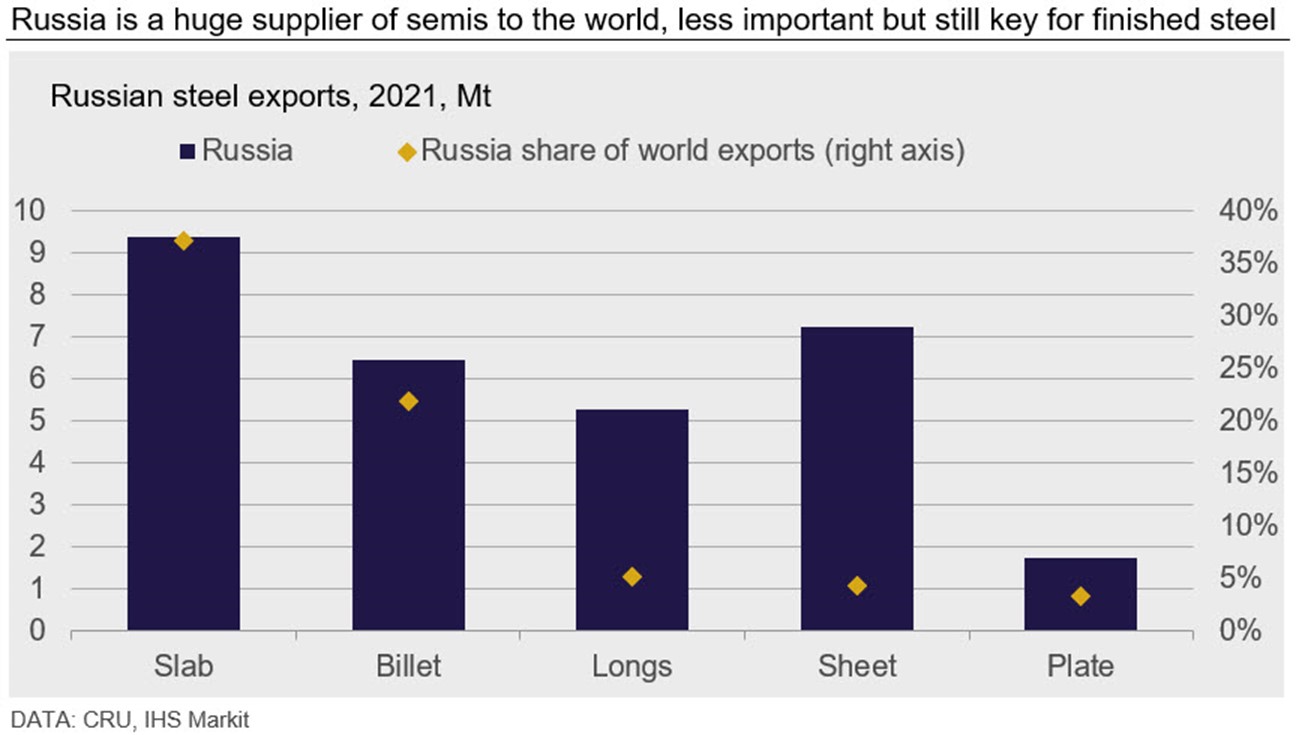 Russia is the largest exporter of both slab and billet to the world, based on 2021 export volumes. In finished steel it is less systemically important but still among the world’s key suppliers, ranking as the 6th largest longs exporter and 8th largest flats exporter globally.