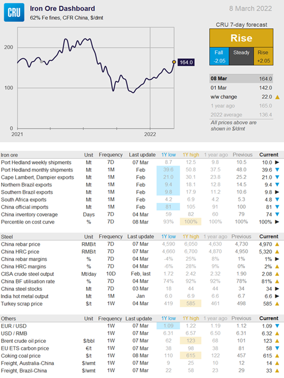 The war in Ukraine has caused a dramatic rise in the iron ore price, which now stands at $164 /dmt. European steelmakers are now scrambling to find iron ore to replace lost imports from Ukraine and Russia. The market will take more than the upcoming week to settle into a new equilibrium.