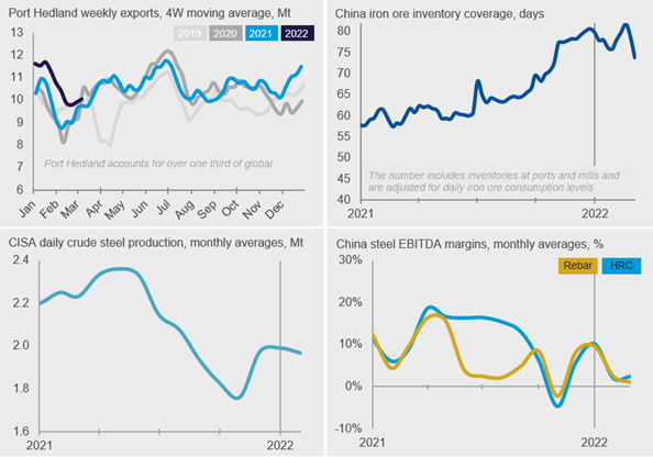 Iron ore has seen a dramatic rise, which will continue. European steelmakers will burn through stocks and become increasingly desperate for iron ore, and we see a high chance of steel production in Europe eventually being cut if the ability to source raw material worsens. Supply from other regions will take time and create a knock-on effect of reduced availability for other regions.