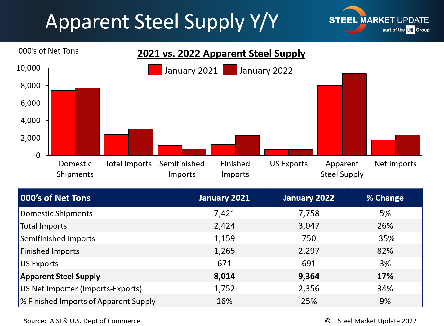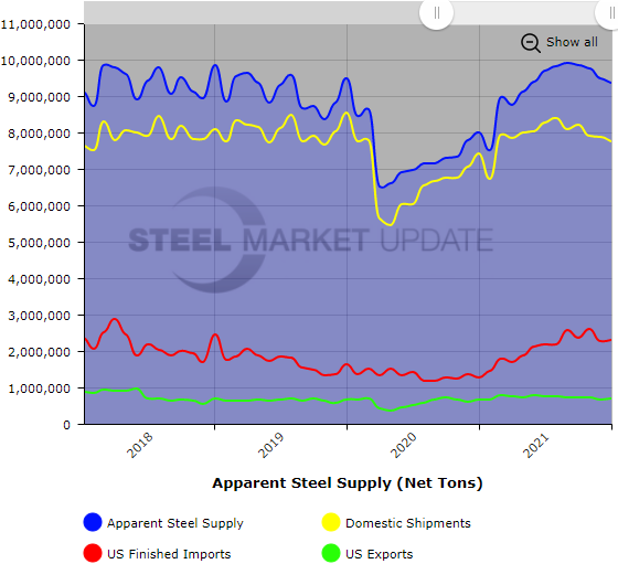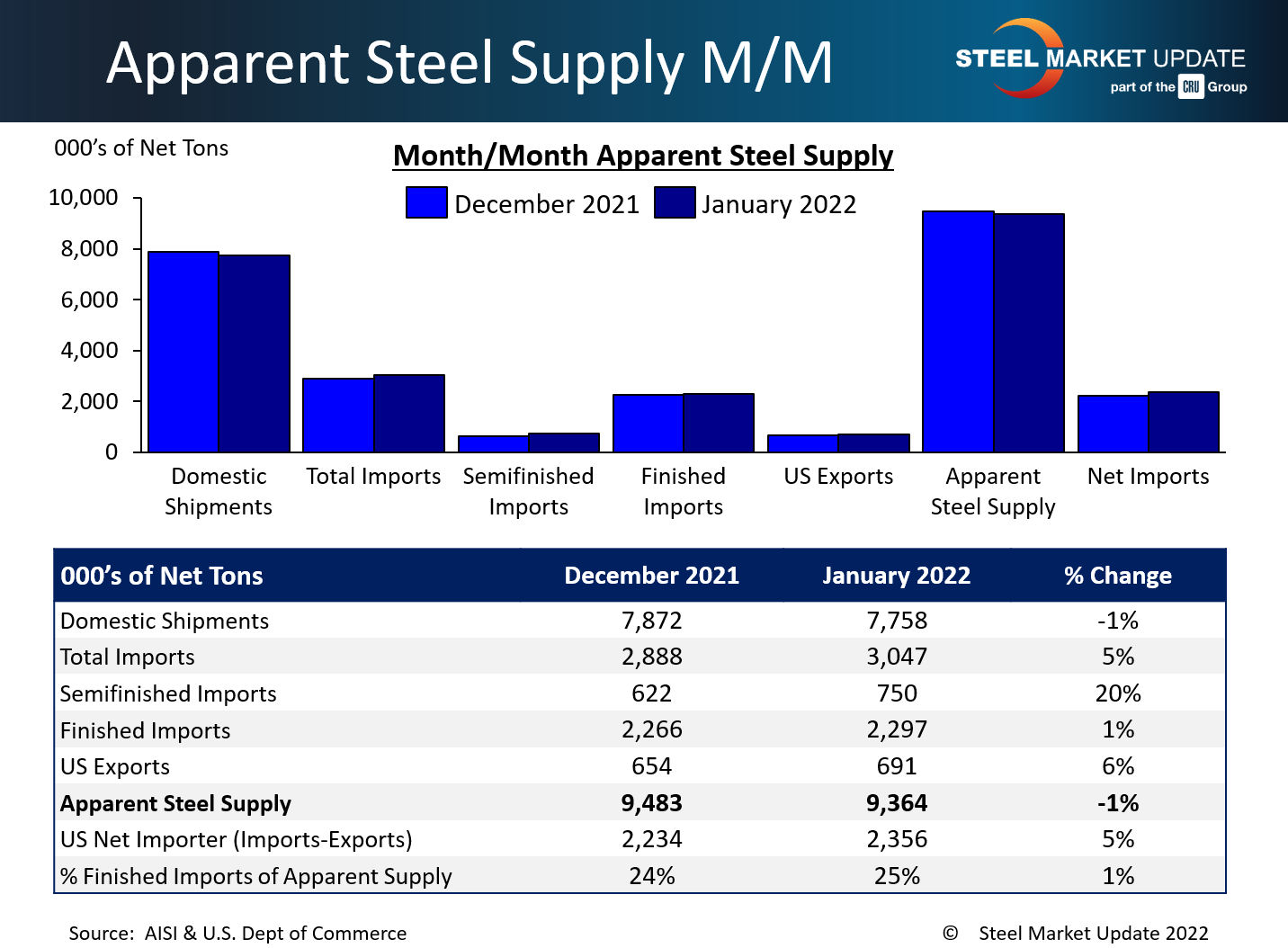 Apparent steel supply, a proxy for demand, is determined by combining domestic steel mill shipments and finished U.S. steel imports, then deducting total U.S. steel exports.