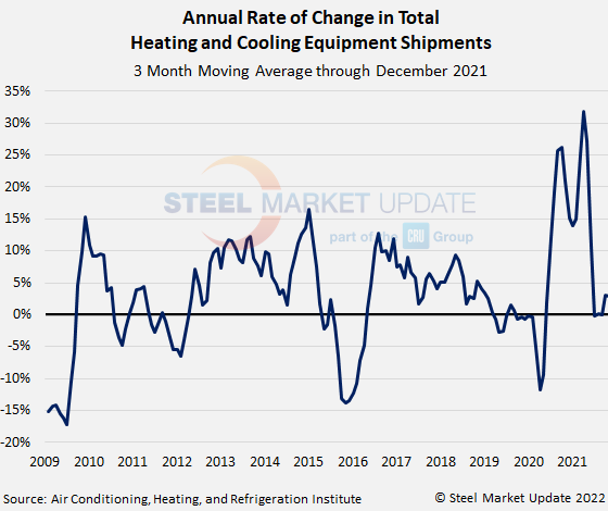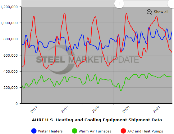 Below is a graph showing the history of total water heater, warm air furnace and air conditioner shipments through January data. To use its interactive features, view the graph on our website by clicking here. For assistance with either logging in or navigating the website, contact Info@SteelMarketUpdate.com.