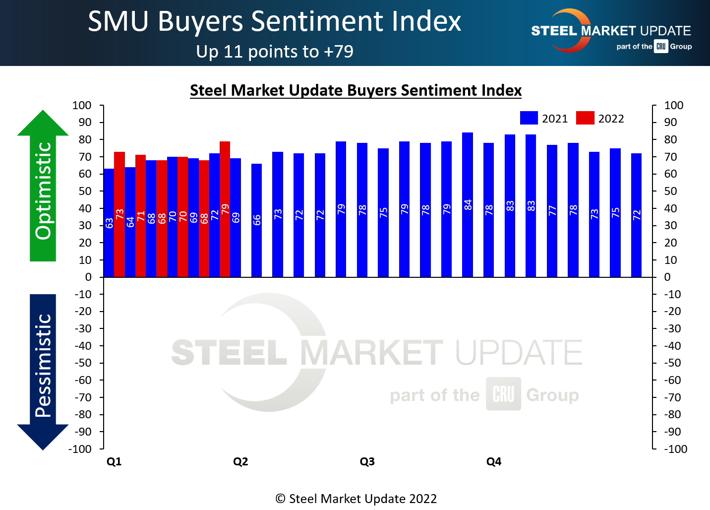 SMU Steel Buyers Sentiment Index is a measurement of the current attitude of buyers and sellers of flat-rolled steel products in North America regarding how they feel about their company’s opportunity for success in today’s market. It is a proprietary product developed by Steel Market Update for the North American steel industry.