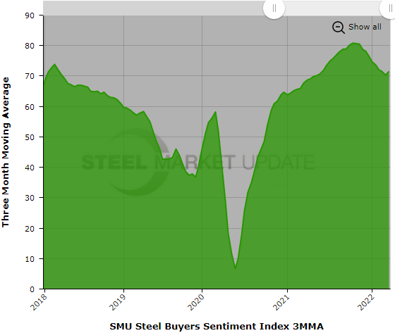 SMU’s Steel Buyers Sentiment Index surged 11 points this week, the largest change from one survey to the next in 17 months. The surprising jump in sentiment correlates with the unexpected rebound in steel prices caused by the conflict in Ukraine.