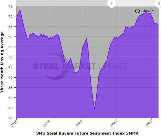 Measured as a three-month moving average, the Current Sentiment 3MMA is at +71.50 and the Future Sentiment 3MMA is at +66.00, showing that steel buyers’ attitudes are mostly unchanged despite volatile market conditions.