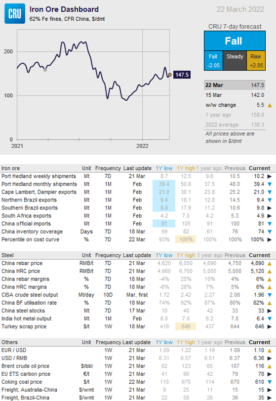 During this week, the price will be driven primarily by demand concerns. Although sintering restrictions have been eased, lockdowns have hit too many major iron ore buyers in China. This, in combination with strengthening seaborne supply, despite the impacts of the war in Ukraine, will drive the price down.