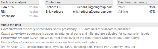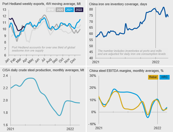 In Ukraine, Russian forces have reached Dnipro, where the majority of iron ore mining is conducted. This region was subject to bombings from Russia in the past two weeks. Soon after the invasion began, ArcelorMittal evacuated its sites, but other producers such as Metinvest continued at limited capacity of ~30-40%. Mariupol is still being fought for, which does not have iron ore mining but had a steelmaking presence that used iron ore produced by Metinvest.
