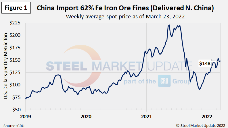 After rising to record levels last summer, the Chinese import price of 62% Fe content iron ore fines declined through November, reaching an 18-month low. Prices have since risen and continue to trek upward; Figure 1 shows the price of 62% Fe delivered North China at $148 per dry metric ton as of March 23. Iron ore prices have increased 10% in the last 30 days, up 26% compared to three months ago, yet down 8% from the price this time last year.