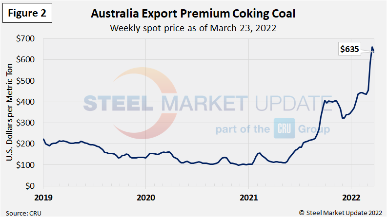 The price of premium hard coking coal FOB east coast of Australia surged to $635/dmt as of March 23, second to the $660/dmt record price seen the week prior (Figure 2). Prices have increased 45% in the last 30 days, up 86% compared to three months prior, and up 458% from prices one year ago. In 2021, coking coal prices rose to a record-high of $405/dmt in October/November. Prior to that, the previous record for coking coal prices was $400 per ton in July 2008.