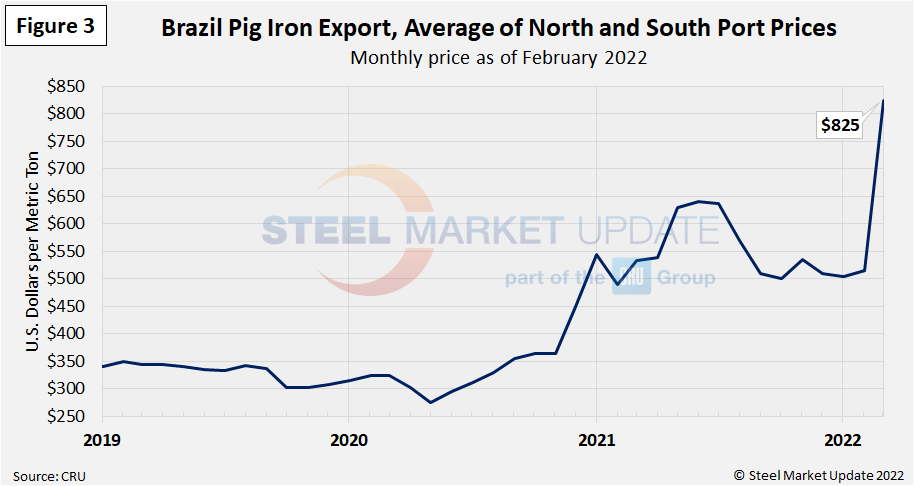 Most of the pig iron imported to the U.S. currently comes from Russia, Ukraine and Brazil. This report summarizes prices out of Brazil and averages the FOB value from the north and south ports. Pig iron prices had been relatively stable for the last few months, but surged 60% in March to $825 per metric ton. Prior to this month, pig iron prices had remained historically high for over a year. Recall that pig iron prices had reached a multi-year low of $275 per metric ton in May 2020 (Figure 3).