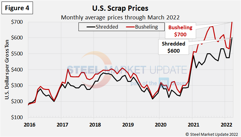 Scrap prices rose to record-high levels in March; shredded scrap prices increased 26% to $600 per gross ton, and busheling scrap prices were up 32% to $700 per gross ton (recall busheling’s record high of $670 seen back in July/August). Prior to 2021, the previous record for scrap prices over the last decade was $510 per ton for busheling in December 2011 and $473 per ton for shredded in February 2012.
