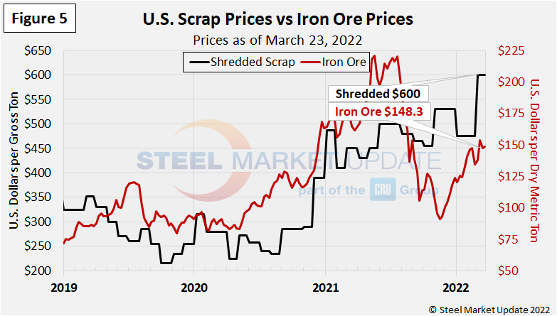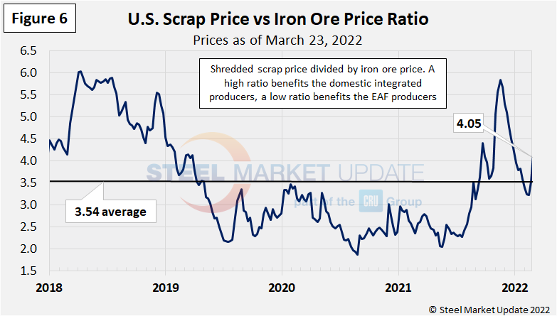 To compare the two, Steel Market Update divides the shredded scrap price by the iron ore price to calculate a ratio (Figure 6). A high ratio favors the integrated/BF producers, a lower ratio favors the minimill/EAF producers. At the current 4.05 ratio shown below, the brief cost advantage held by integrated producers in late-2021 could be coming back. Four months ago we saw a ratio of 5.84, the highest seen since mid-2018. The scrap to iron ore ratio reached a record low of 1.86 in August 2020 (within SMU’s limited 12-year data history).