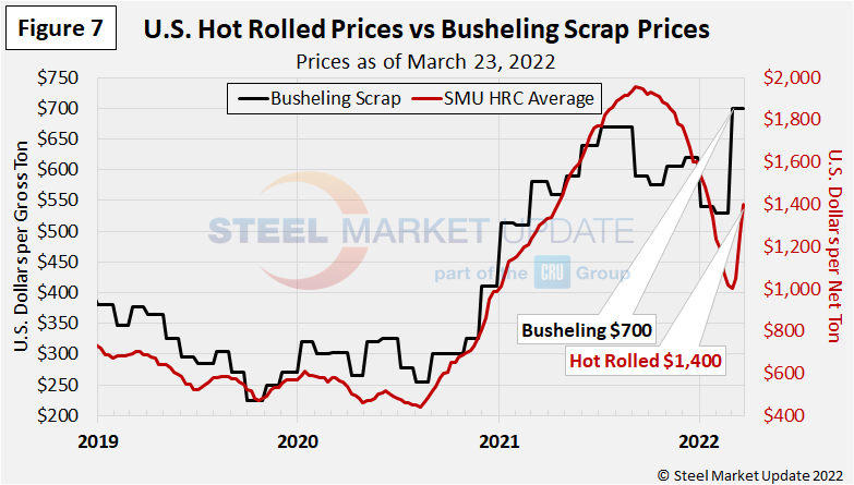 Figure 7 shows how the price of hot rolled steel generally tracks with the price of busheling scrap. Bush rose $170 per gross ton over the past month, up $30 from the July/August peak, and up $120 from one year ago. The SMU hot rolled price average increased this week for the third consecutive time with the March 22 average up $140 week over week to $1,400 per ton. This is an increase of $380 per ton compared to the prior month, down $555 from the early-September peak, and up $70 from one year ago.