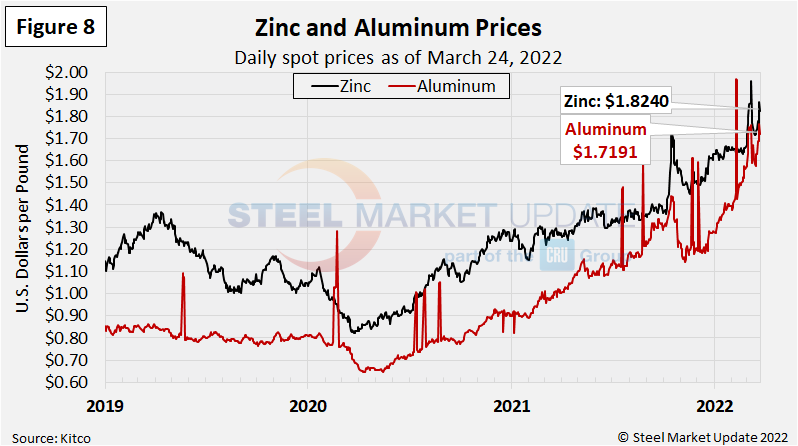 Zinc, used to make galvanized and other products, continues to increase in price in line with other raw materials, albeit at a lesser rate. The LME cash price was $1.82 per pound as of March 24, up 13% from three months prior and up 44% from the same time last year (Figure 8). The LME cash price for zinc reached a single-day record of $1.96 per pound on March 8, with the runner up occuring March 22 at $1.87 per pound.