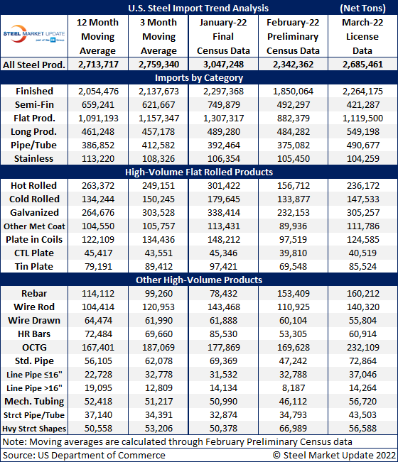 Due to large month-to-month swings in semifinished imports, the chart below shows total monthly imports on a three-month moving average (3MMA) basis in an attempt to more accurately display U.S. steel import trends. The 3MMA through preliminary February data is 2.76 million tons, down from January’s 42-month high but still lofty compared to recent years. (2021 averaged 2.63 million tons per month, 2020 averaged 1.84 million tons per month, 2019 averaged 2.32 million tons per month.) Recall that the lowest 3MMA level in SMU’s recent history was October 2020, at 1.36 million tons. With the latest March license data, that 3MMA is at 2.69 million tons.