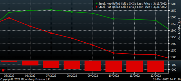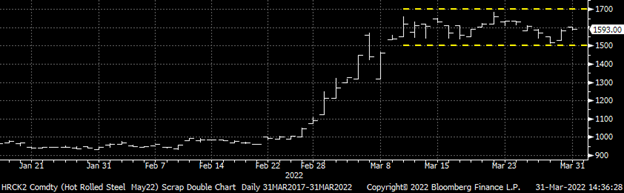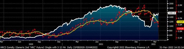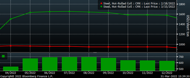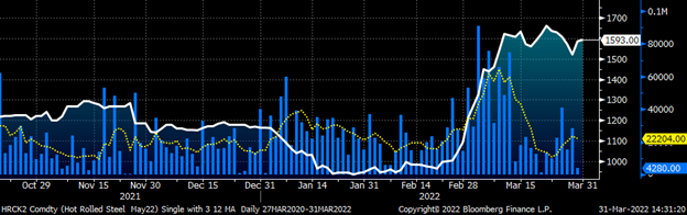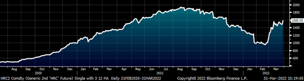 The relentless buying squeezed the shorts and forced liquidations as the CME’s increased margin rates further exacerbated the squeeze. This positive feedback loop – of shorts being squeezed, forcing the next margin call, forcing the next weakest short to meet the margin call or be squeezed out of their position – seemed like it would never end. Some of the rally had to do with domestic fundamentals that had led up to Cleveland Cliff’s price increase announcement on February 21. But it was the supply shock caused by Russia’s invasion of Ukraine that created a frenzied and chaotic eruption of buying across the commodities landscape. From oil to wheat to nickel, the price action, volatility and collateral damage was extraordinary. The London Metals Exchange had to halt trading in nickel futures for six trading days!