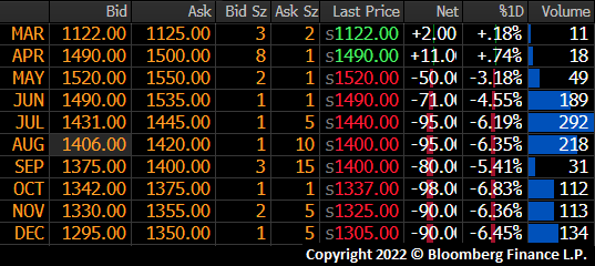 Volume exploded over the three week period. This chart of the May future shows the daily volume in tons across the curve with a five-day moving average in yellow. Note that since mid-March, volume has cratered. Trading has all but ground to a halt with only 4,280 tons trading yesterday and 9,080 tons trading today.