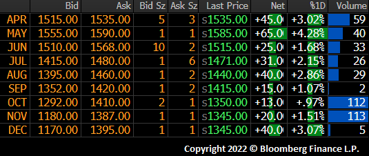 Since mid-March, the front of the curve has been range bound. You can see the May future below trading between $1,500 – $1,700 since.