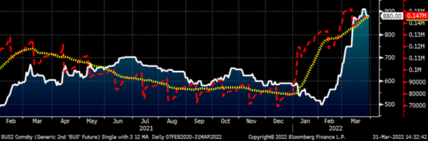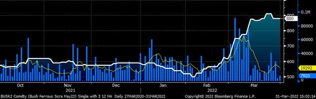 One key difference between the busheling and HRC futures market is that open interest in busheling has been expanding since the start of the year while HRC has been falling sharply. For busheling, this indicates a technically strong bull market and a market participant or participants building a relatively sizable long position. On the day of the expiration of the March future, the busheling futures set a new all-time record for open interest at 151,920 tons.