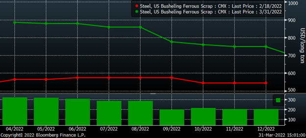 With so much riding on the war in Russia, it is no surprise that volume in HRC and busheling futures has reversed so quickly. The futures market moved rapidly higher, but the physical market has followed closely with a two-week lag. If the futures were to plummet, would the physical market follow it back down? As shown above, a lot can happen in three weeks, and I am extremely curious to know what I will be writing about in my next SMU article three weeks from now.