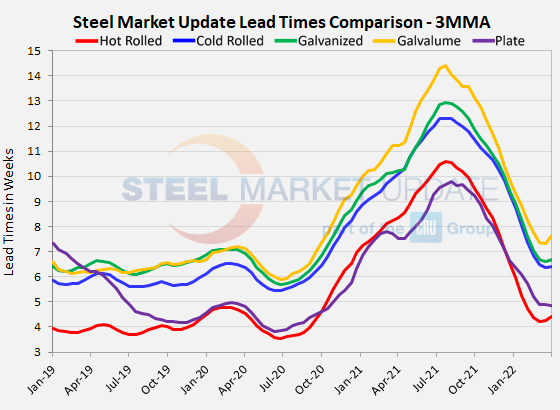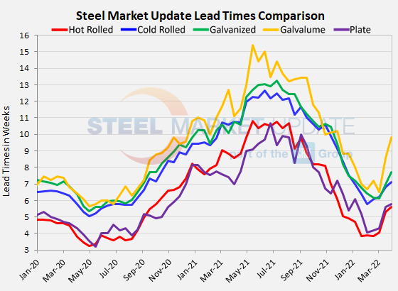 Buyers surveyed Monday through Wednesday of this week reported mill lead times ranging from 4-8 weeks for hot rolled, 6-8 weeks for cold rolled, 5-10 weeks for galvanized, 7-12 weeks for Galvalume, and 5-8 weeks for plate.