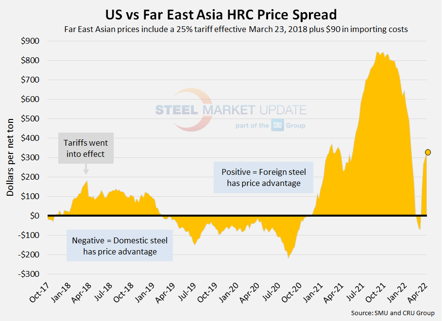 As of Wednesday, April 6, the CRU Far East Asian HRC price has remained flat for the past two weeks at $835 per net ton ($920 per metric ton), up $9 from one month prior. Adding a 25% tariff and $90 per ton in estimated import costs, the delivered price of Far East Asian HRC to the US is $1,133 per ton. The latest SMU hot rolled price average is $1,460 per ton, up $25 from one week prior, and up $410 from one month ago. Therefore, US-produced HRC is now theoretically $327 per ton more expensive than imported Far East Asian HRC. That differential was $302 per ton last week and $267 per ton two weeks prior. This is the fourth consecutive week foreign steel prices have held this price advantage. We saw the opposite one month ago when domestic HRC was $72 per ton cheaper than Far East Asian prices. The largest price spread between these regions was $847 per ton in September 2021, when Far East Asian prices held a considerable advantage.
