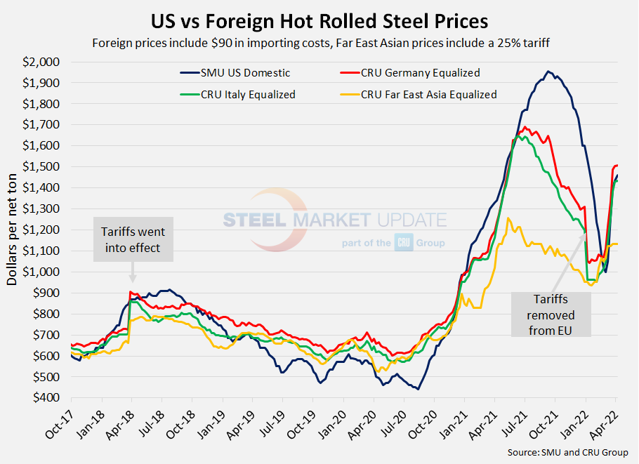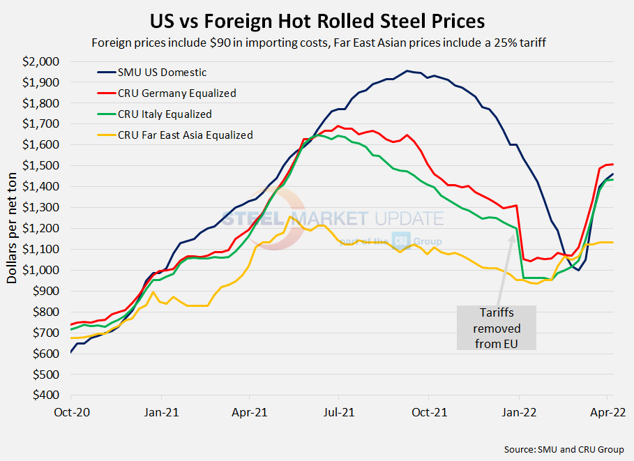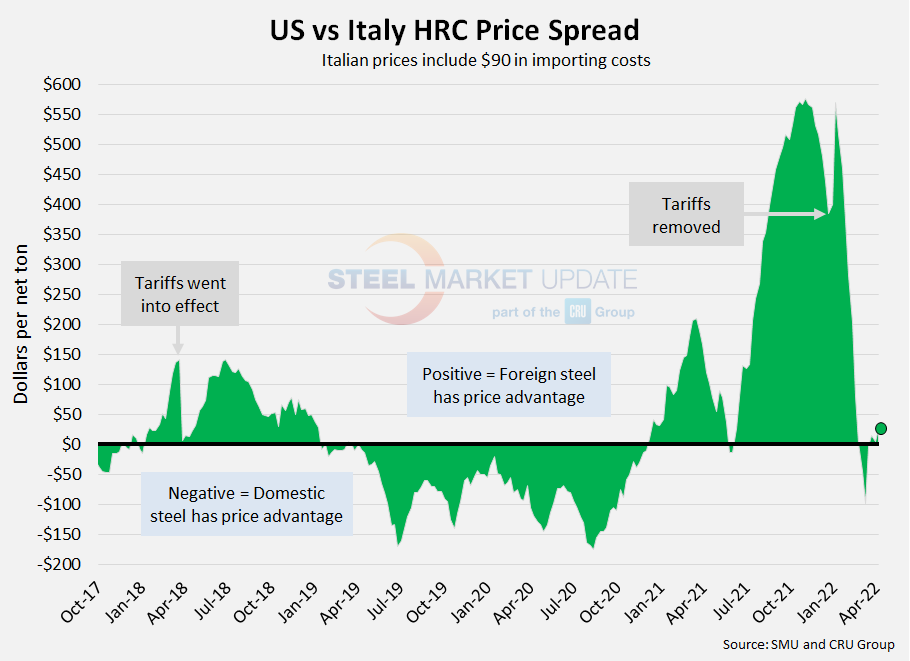 The following calculation is used by Steel Market Update to identify the theoretical spread between foreign hot rolled steel prices (delivered to US ports) and domestic hot rolled coil prices (FOB domestic mills). This is only a “theoretical” calculation as freight costs, trader margins, and other costs can fluctuate, ultimately influencing the true market spread. This compares the SMU US hot rolled weekly index to the CRU hot rolled weekly indices for Germany, Italy and Far East Asian ports.