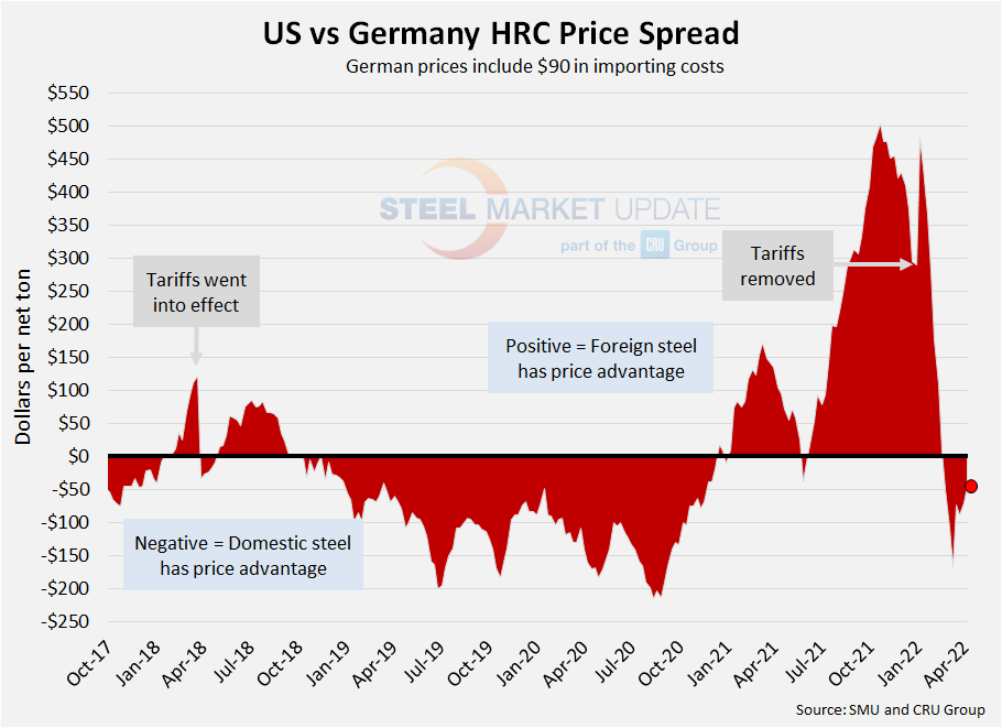 The latest CRU German HRC price is $1,416 per net ton ($1,561 per metric ton), up $1 per ton from last week and up $289 per ton from one month ago. After adding import costs, the delivered price of German HRC is approximately $1,506 per ton. Accordingly, domestic HRC is theoretically $46 per ton cheaper than imported German HRC, down from $70 per ton last week. One month ago, German prices were $167 per ton more expensive than domestic steel. This is the seventh consecutive week that domestic steel prices have held this price advantage. Prior to removal of the 25% tariff, the October 2021 spread of $504 per ton was the largest seen in SMU’s data history.