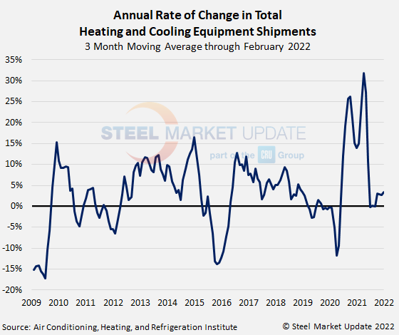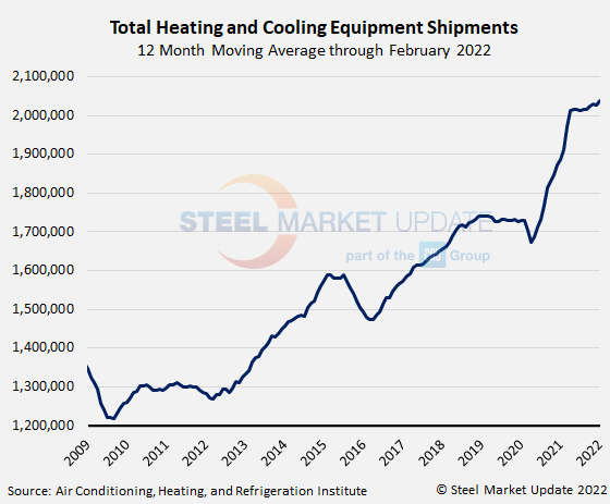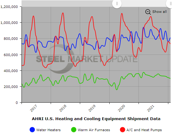 Below is a graph showing the history of total water heater, warm air furnace and air conditioner shipments through February data. To use its interactive features, view the graph on our website by clicking here. For assistance with either logging in or navigating the website, contact Info@SteelMarketUpdate.com.