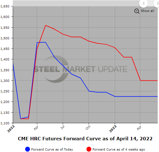 Below is a graph showing the history of the CME Group hot rolled futures forward curve. You will need to view the graph on our website to use its interactive features; you can do so by clicking here. If you need assistance with either logging in or navigating the website, please contact us at info@SteelMarketUpdate.com.