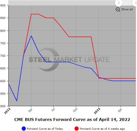 Below is another graph showing the history of the CME Group busheling scrap futures forward curve. You will need to view the graph on our website to use its interactive features; you can do so by clicking here.
