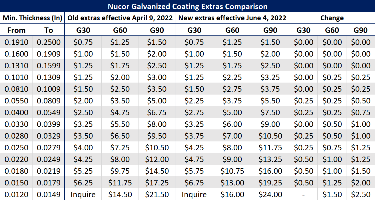 “Consistent with our practice to monitor the cost of zinc, we have revised our galvanized coating weight extras effective with orders acknowledged for week ending June 4, 2022” a letter from Nucor stated. New price extras can be accessed on the Nucor website here under the ‘Sheet’ tab.