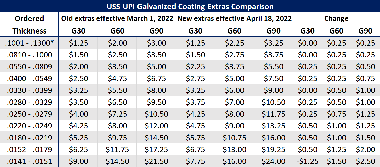 On Monday, April 18, Nucor and USS-UPI both notified customers of an upward revision to their galvanized steel coating extras. New Nucor extras are effective June 4, 2022, while USS-UPI extras are effective immediately (April 19, 2022).