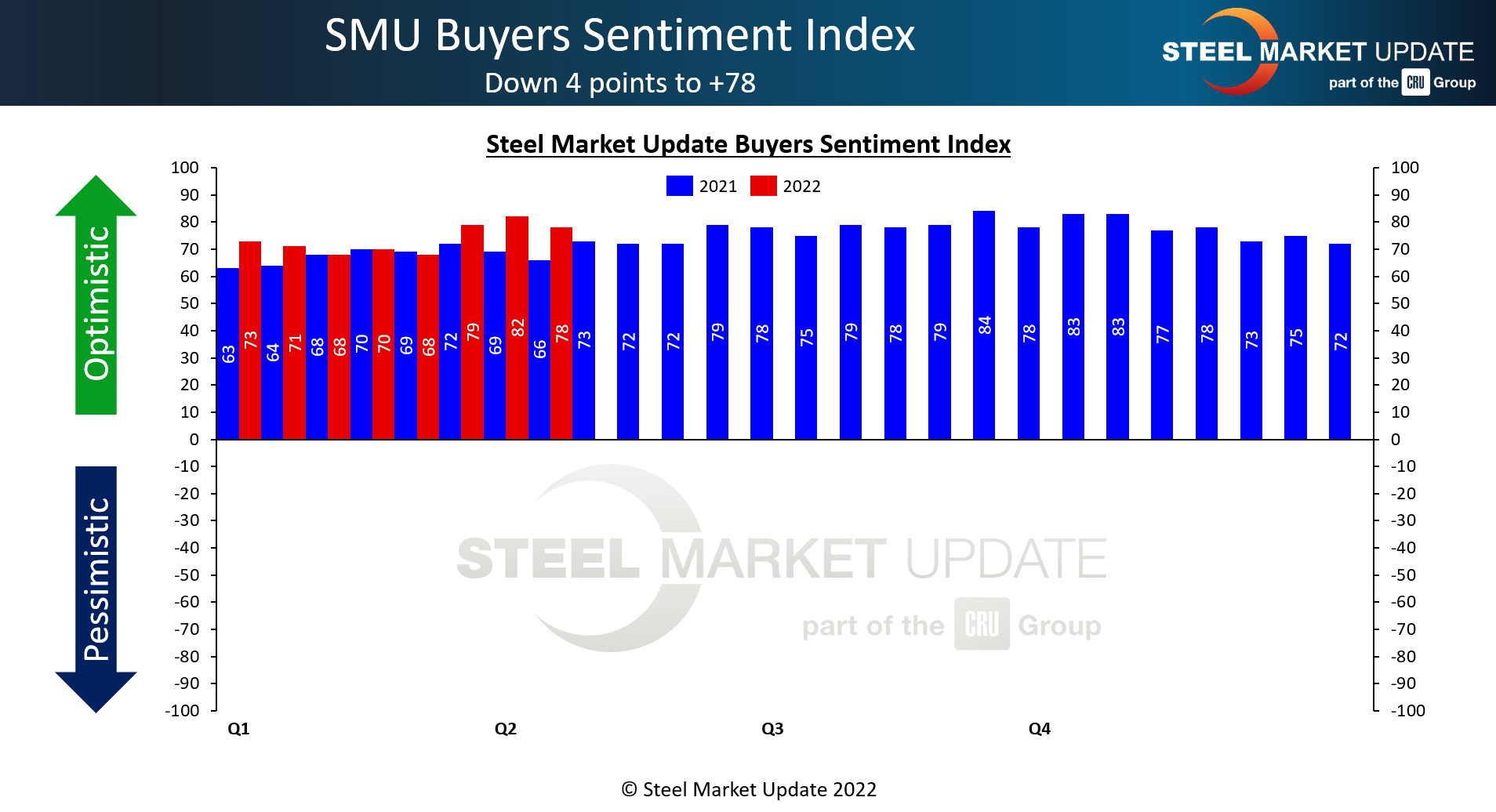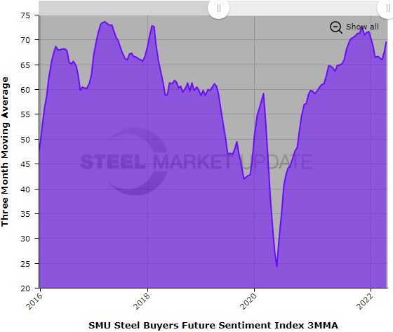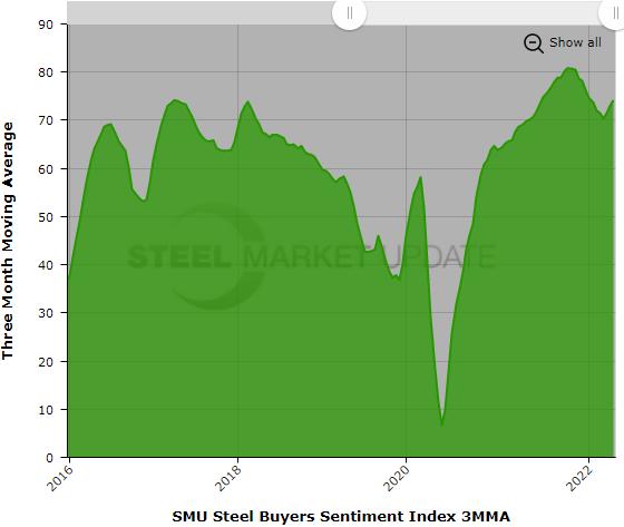 Steel Market Update’s Steel Buyers Sentiment Index moved 4 points lower this week, following a 3-point bump up two weeks prior and an 11 point surge in mid-March. Theses sentiment measures correlate with the sharp rebound in steel prices caused by the Ukraine-Russia war, as well as the recent slowdown seen in prices.
